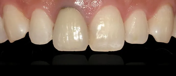 過去に治療した右上前歯のセラミックが、周囲の歯と色調が合っていない状態です。