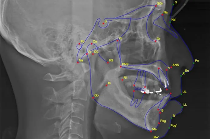 セファロ分析(頭部X線規格写真)では、お口と歯だけでなく、お顔全体のレントゲン撮影を行い、顎や顔全体の骨格バランスを確認します。歯並びや噛み合わせはお顔全体のバランスと密接に関係しており、矯正治療を行ううえで重要な判断材料となります。