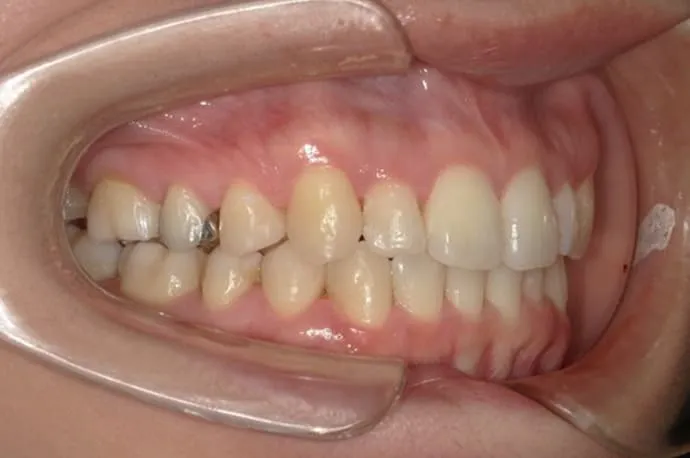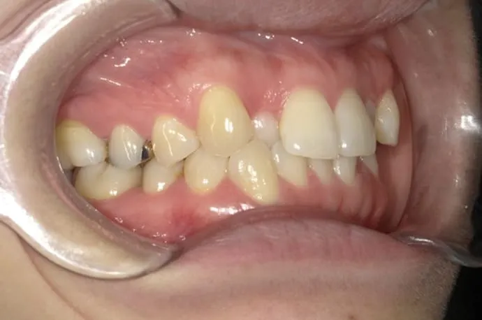 下記画像は、他院にて抜歯が必要と診断された患者さまの症例です。当院でも同様の診断結果でしたが、ご本人のご希望を踏まえ、抜歯を行わずに矯正治療を実施しました。患者さまのご協力もあり、良好な治療結果につながった一例です。