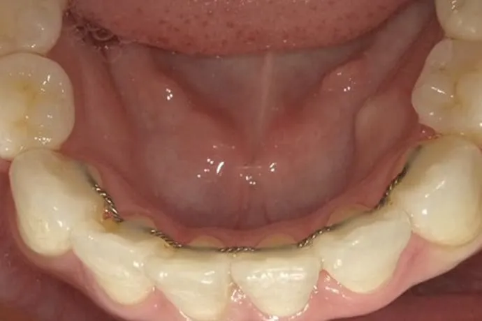 当院では、写真のように歯の裏側に細いワイヤーを装着する方法や、マウスピース型の保定装置など、患者さま一人ひとりの状態に合わせて最適な方法をご提案しています。